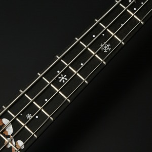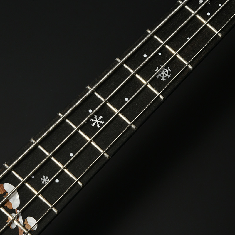 指板インレイには、桜の枝に雪が静かに積もる様子を表現し、春と冬が交わる一瞬の風景を描いています。指板材のエボニーは定番のローズウッドなどに比べて重量があり、立ち上がりが早く輪郭のあるトーンと伸びやかなサスティーンを生み出します。
