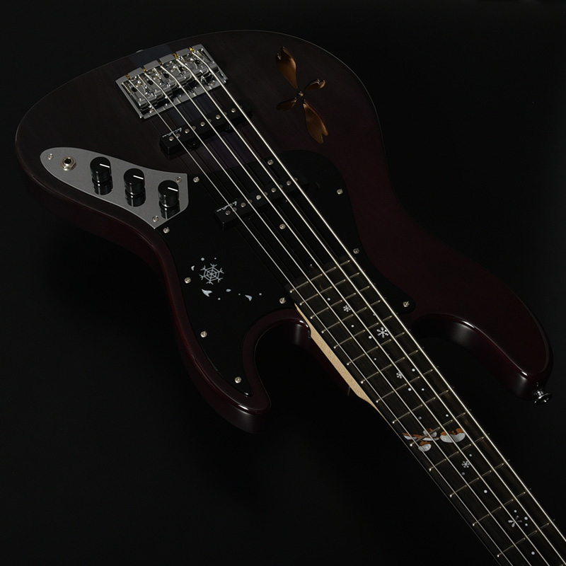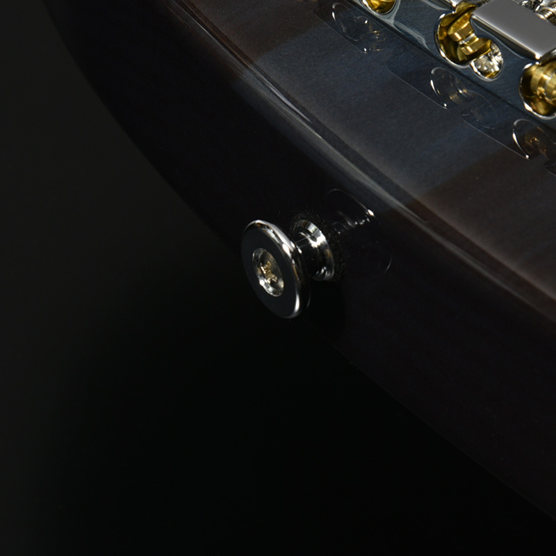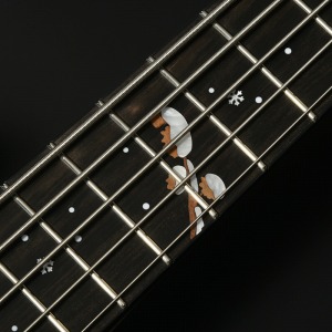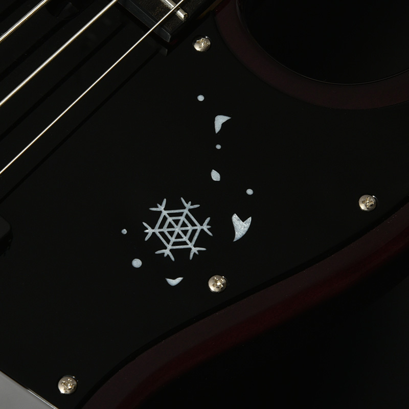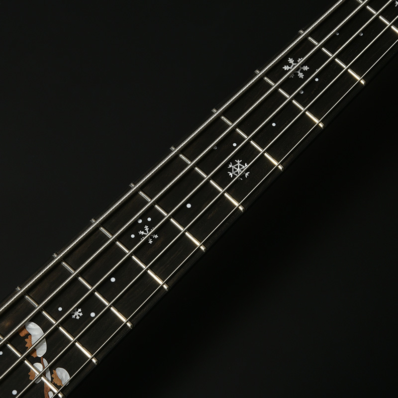 指板インレイには、桜の枝に雪が静かに積もる様子を表現し、春と冬が交わる一瞬の風景を描いています。指板材のエボニーは定番のローズウッドなどに比べて重量があり、立ち上がりが早く輪郭のあるトーンと伸びやかなサスティーンを生み出します。