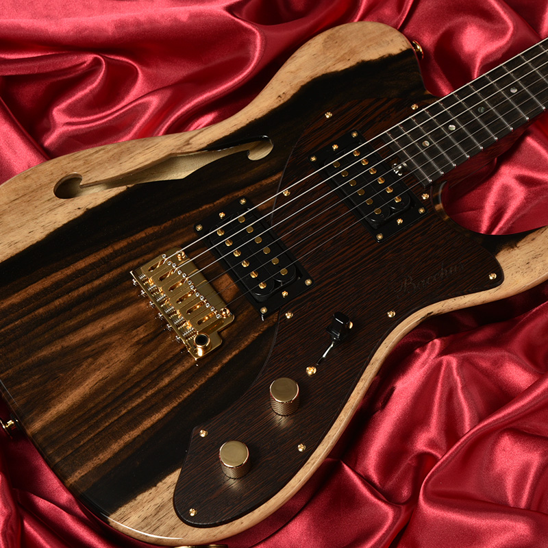 Bacchusの30周年を記念して、最上位機種 T-HOLLOW がプレミアムコレクションに登場。柿の木の中でも樹皮に含まれるタンニンの成分によって黒化した部分の割合が多い個体を特にクロガキと称します。太く存在感のある木目が、唯一無二のデザインとして現代のギターに宿りました。高級家具や建材として珍重されてきた希少材でもあり、黒を基調とした木目からナチュラルな仕上げとよくマッチします。