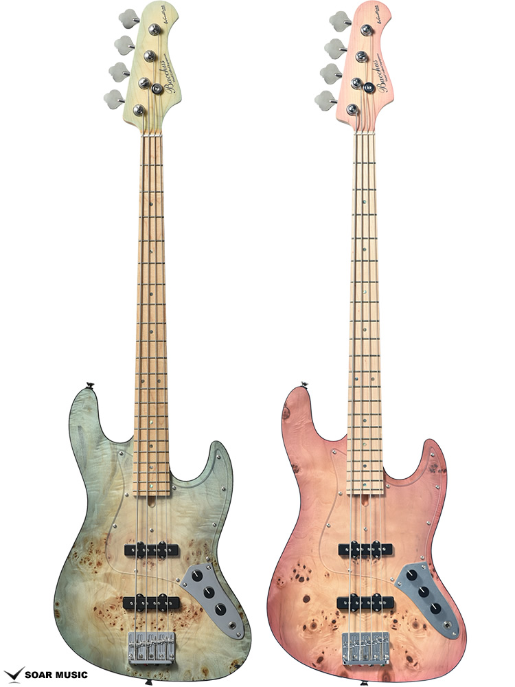 本モデルは過去にBacchus Handmade Seriesから限定モデルで登場した、KRB(渓流ブルー)とSYP(ソメイヨシノピンク)のカラーリングを踏襲した淡い色合いで仕上げています。薄い色のバーストは技術を要しますが、国産モデルを製造している飛鳥工場の職人の熟練した塗装技術を再現。メイプルの指板を含めてベース全体の外観を柔らかな雰囲気でまとめました。