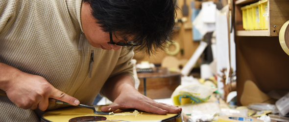 一流のギタークラフトマンは加工技術そのものだけでなく、状況を俯瞰する視点、柔軟な発想、その発想を形にする実行力も持ち合わせているものです。2002年から本格的にギター作りの道に入った安井雅人は、飛鳥チームビルドシリーズにおけるチームの実質的なリーダーとしてその力を発揮。現在はこのシリーズと平行して、自身のカスタムモデル制作も行います。