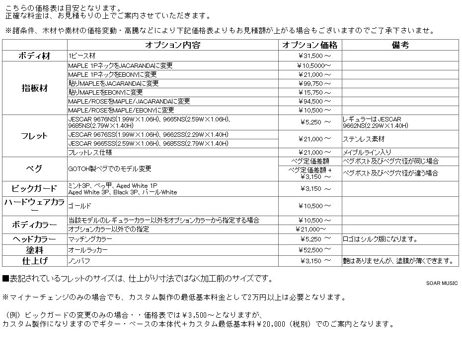 ※カラーオーダーやピックガードの変更などのマイナーチェンジのみの場合でも、基本カスタム料金として2万円以上は必要になりますのでご了承下さいませ。