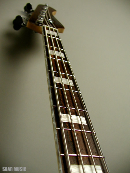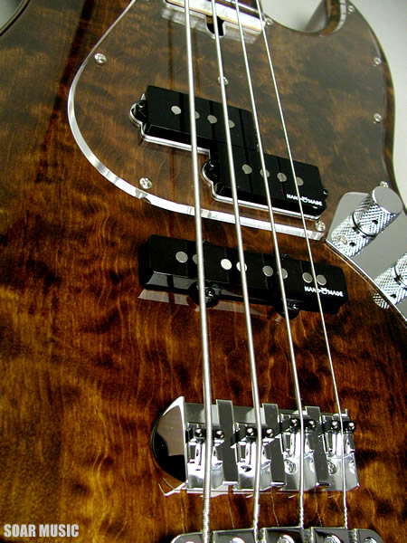 フロントにプレベタイプのシングルコイル・ピックアップを低音弦/高音弦に分け、