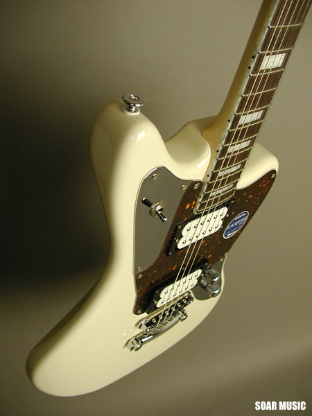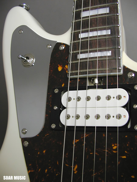 独特のボディシェイプ、ネックサイドには美しいホワイトパール柄のバインディング、