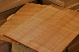 ギターやベースに頻繁に使用されるフレイム杢の木材と言えばメイプル(楓)ですが、そのメイプルの杢に比べて幅が広めなものが多いレッドウッド。今回使用している木材も、比較的幅の広いものから細かなものまで一つ一つが個性的でそれぞれに良さがあります。