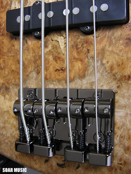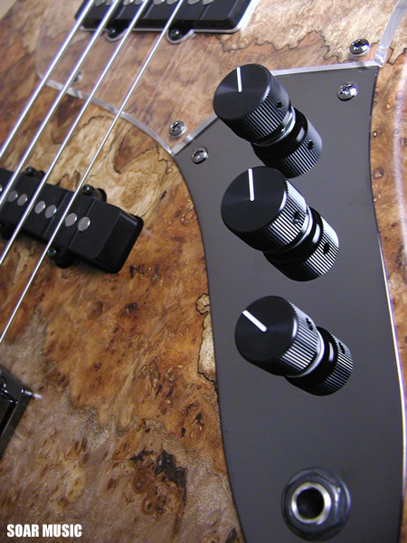 通常の2ピックアップタイプのベースはフロントピックアップ、 リアのピックアップをパラレル(並列)で配線してますが、 WOOD LINE ASH はターボスイッチを搭載しており、 トーンノブを引っ張るとフロント/リアピックアップを連動させたシリーズ(直列)回路に 切り替わり、出力がアップします。 ターボON (シリーズ)時はフロント/リアピックアップが 連動し、ハムバッキングタイプの ピックアップになり、フロントピックアップの ボリュームノブで音量調節が可能になります。 |
