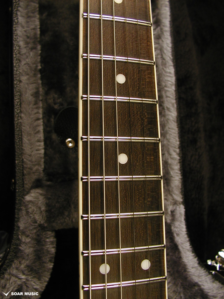 番手の違うサンドペーパーやスチールウールなどを使い分け、各フレットのエッジ部分に丁寧に丸みを付けることにより、左手の移動が滑らかになりました。ハイフレットまで滑るように移動が可能です。