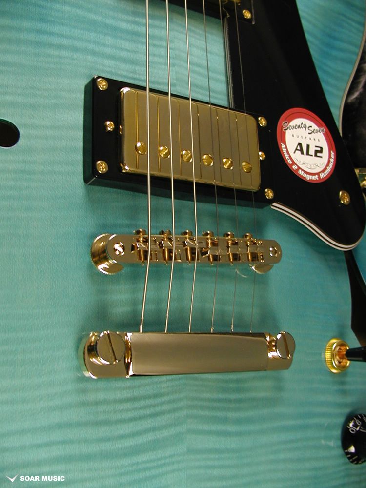 アルニコ2マグネットを採用したSeventySevenオリジナルピックアップ、 「SeventySeven AL2」を搭載。クリーントーンではきらびやかな鈴鳴り感を表現しつつも耳に痛くない暖かさを併せ持ち、ドライブをかけると歯切れの良いエッジの効いたクランチサウンドを出力します。プレイヤーの創造力を膨らませて豊かな演奏表現を生み出します。