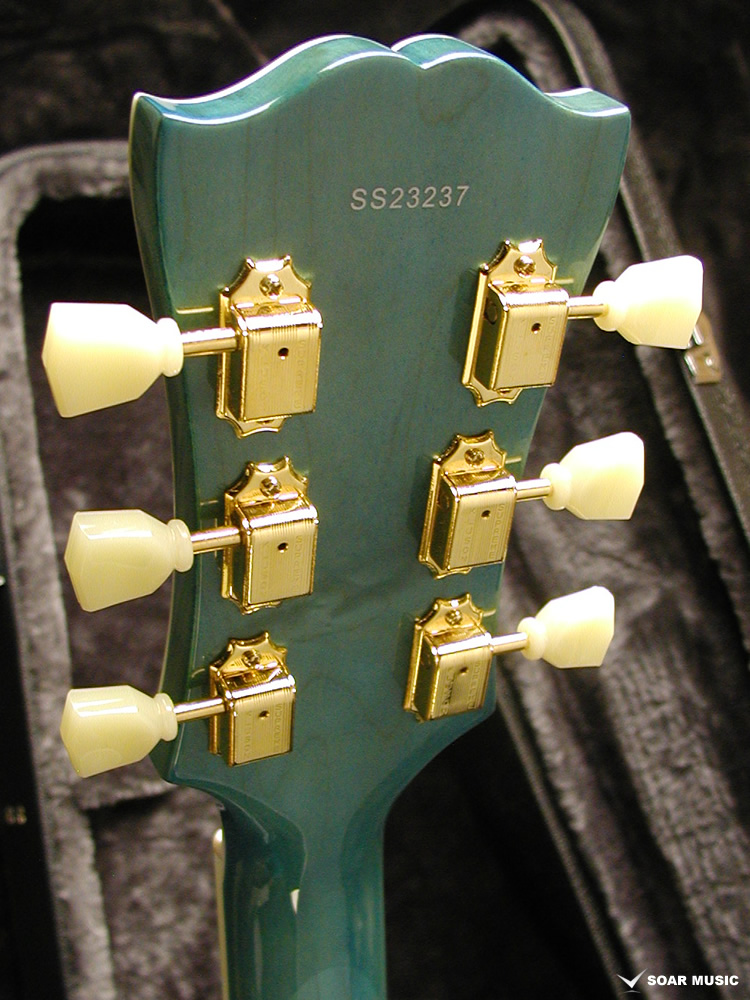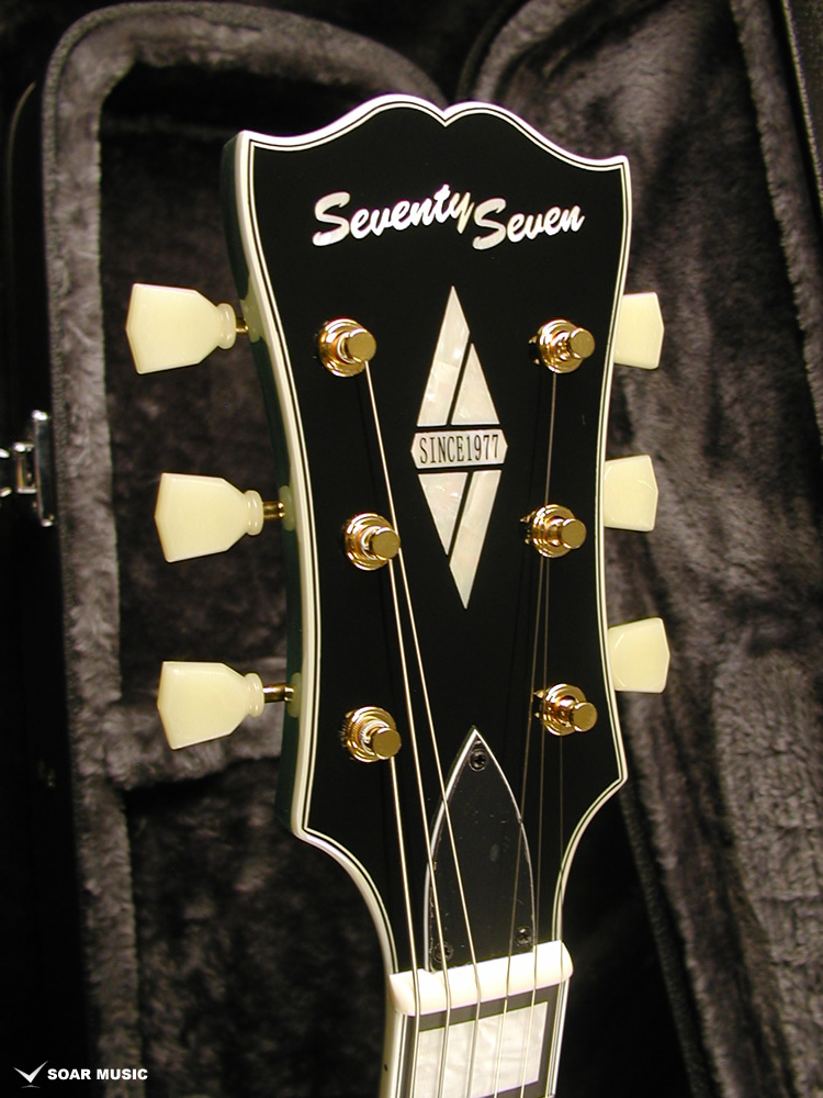 “77”を図案化したオリジナルのヘッドインレイが輝くヘッド。バインディングと組み合わせてスタンダードモデルには無い豪奢な雰囲気が漂います。