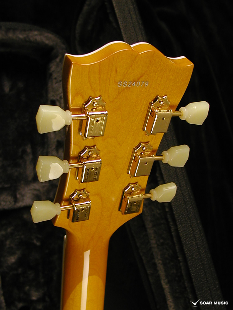 “77”を図案化したオリジナルのヘッドインレイが輝くヘッド。バインディングと組み合わせてスタンダードモデルには無い豪奢な雰囲気が漂います。