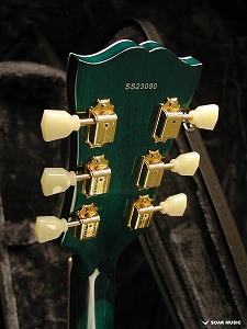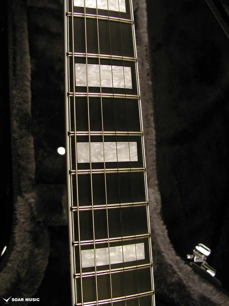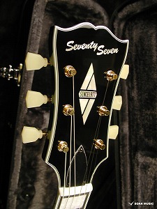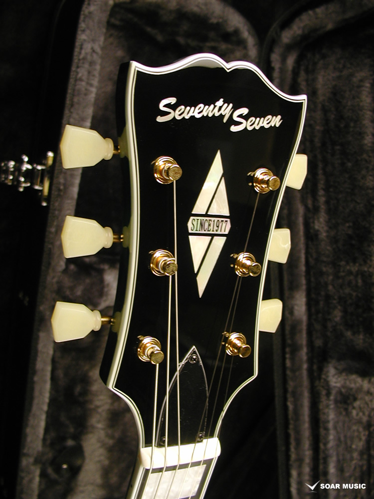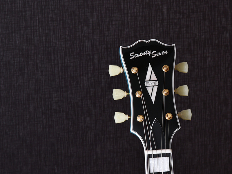 “77”を図案化したオリジナルのヘッドインレイが輝くヘッド。バインディングと組み合わせてスタンダードモデルには無い豪奢な雰囲気が漂います。