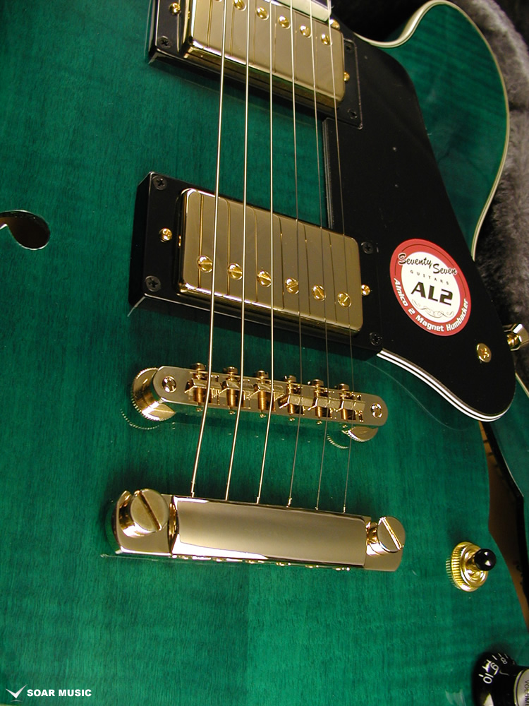 アルニコ2マグネットを採用したSeventySevenオリジナルピックアップ、 「SeventySeven AL2」を搭載。クリーントーンではきらびやかな鈴鳴り感を表現しつつも耳に痛くない暖かさを併せ持ち、ドライブをかけると歯切れの良いエッジの効いたクランチサウンドを出力します。プレイヤーの創造力を膨らませて豊かな演奏表現を生み出します。