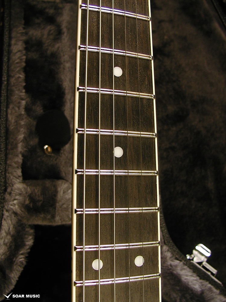 番手の違うサンドペーパーやスチールウールなどを使い分け、各フレットのエッジ部分に丁寧に丸みを付けることにより、左手の移動が滑らかになりました。ハイフレットまで滑るように移動が可能です。