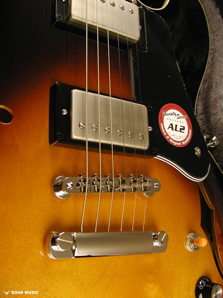 アルニコ2マグネットを採用したSeventySevenオリジナルピックアップ、 「SeventySeven AL2」を搭載。クリーントーンではきらびやかな鈴鳴り感を表現しつつも耳に痛くない暖かさを併せ持ち、ドライブをかけると歯切れの良いエッジの効いたクランチサウンドを出力します。プレイヤーの創造力を膨らませて豊かな演奏表現を生み出します。