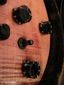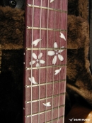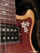 桜のインレイの入ったパープルハート材のピックガード、また、エスカッションもパープルハート材で制作されており、雰囲気を損なわないよう細部までの拘り、飛鳥ファクトリーの木工技術がふんだんに発揮されています。