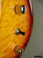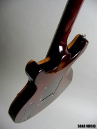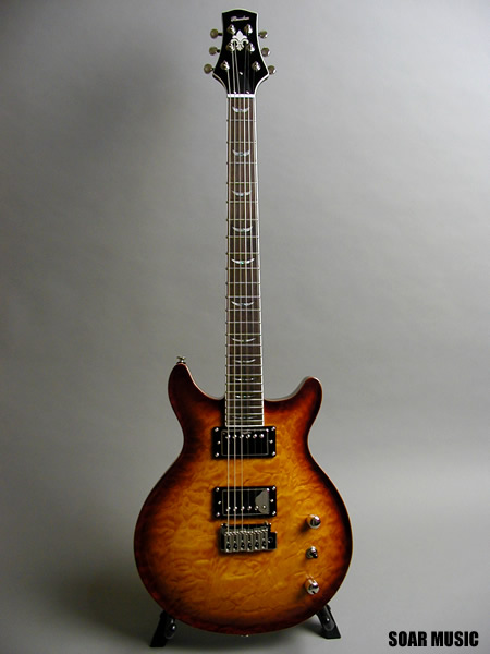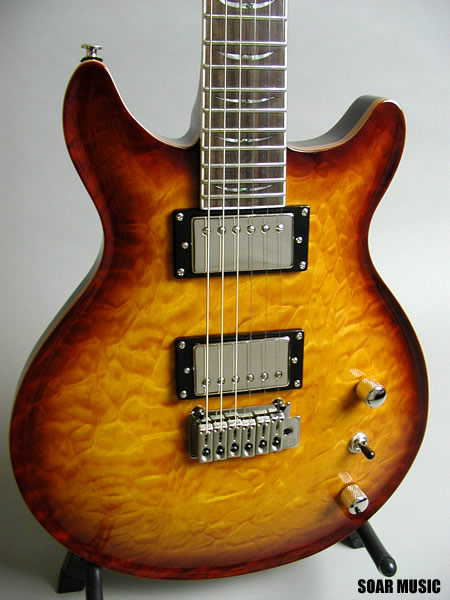 演奏性に優れたコンパクトなシェイプのダブルカッタウェイモデル。オリジナルハムバッキングピックアップはパワフルでありながら歯切れ良く、マホガニーの粘りのある音質を更に引き立てます。上質なキルティッドメイプルに美しいアーチトップ。上品な外観も魅力です。トレモロ搭載タイプ。 |