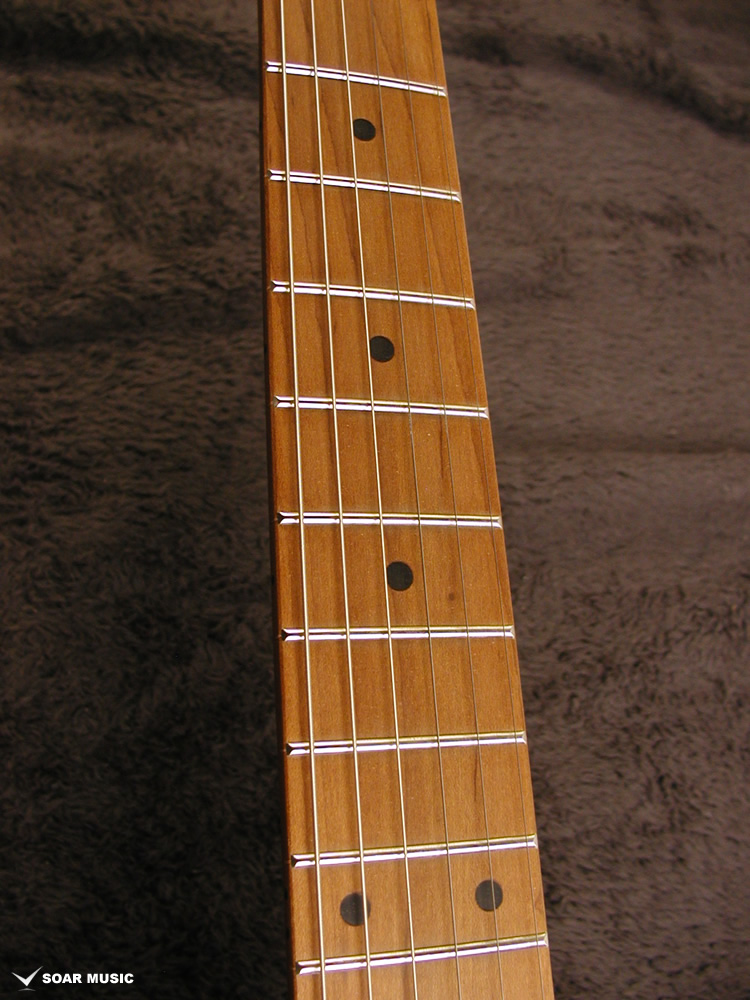 ローステッドメイプルとはメイプルを高温で加熱処理して材の中の水分や油分を揮発させることにより剛性を高めた材。ネックに使用されるとその効果は安定性だけでなくサウンドにも及び、豊かな生鳴りと経年変化したビンテージのようなこなれたトーンを生み出します。