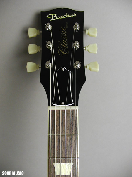 Bacchusクラシックシリーズのレスポールタイプ。長野の国内工場で製作され、価格帯を越えた高い完成度を誇ります。伝統的かつ王道のスタイルで、存在感抜群。材の選定、加工や組上げは勿論、CTSポットやオイルコンデンサー、スイッチクラフト製ジャック等の採用など細部パーツも充実。フィニッシュはラッカーで美しく仕上がっています。材は良質のマホガニーをボディとネックに据え、ローズウッド指板を採用。2基のハムバッカータイプのBacchusピックアップでコシのある骨太のサウンドを轟かせます。