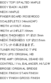 2バンドEQ仕様のオリジナルプリアンプを搭載した、2ハムバッキングPU、そして深いカッタウェイがハイポジションまでの高い演奏性を生み出す24フレットモデル。ボディトップにはエキゾチックな雰囲気に存在感があるスポルテッドメイプルを約12mm厚で贅沢に使用。高級感ある外観に加え、優れた音質をもたらします。Bacchusギグバッグ付属。 ※限定生産ですので、お買い求めの際はお早めにどうぞ。 |