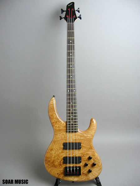 BOB-1000SP です。 ボディバックに使用されたアルダー材の特性である、豊かな中音域と比較的フラットなトーンバランスを活かしながらも、ボディトップには12mm厚のスポルテッド・メイプルを贅沢に使用し、硬質なメイプル材特有のクリアかつ立ち上がりの速いアタックレスポンス、ソリッドなトーンを上手くミックスしたサウンドを創出。幅広い音域を奏でることができる24フレット仕様のネックでフロント/リアピックアップ共にオリジナルハムバッカーを搭載し、さらには高音域・低音域のブースト/ブーストカットが可能なアクティブサーキットも装備。 力強くタイトなサウンドは勿論、繊細なプレイスタイルへ対応できる柔軟さも兼ね備え、幅広いサウンドメイクを可能にしています。 また、24フレットであっても高い剛性とサウンドの伝達が得られるよう、選定されたブリッジとペグパーツを 採用。豊かなサスティン、高い安定性を実現しています。 |