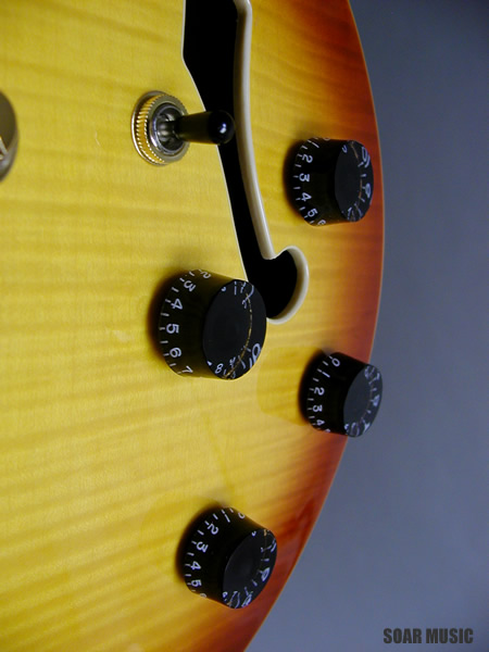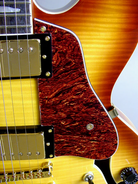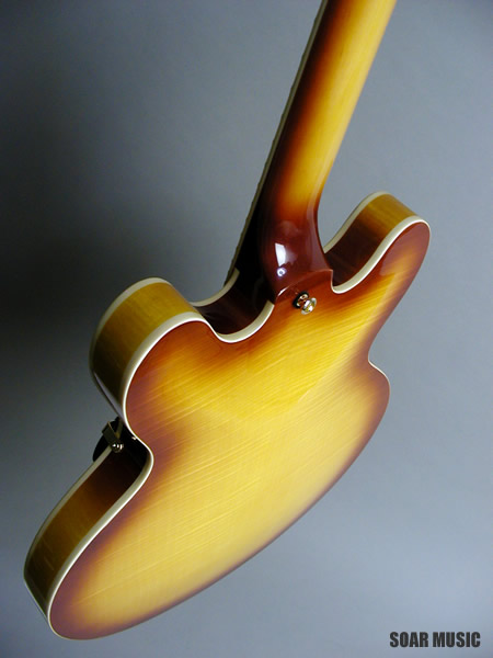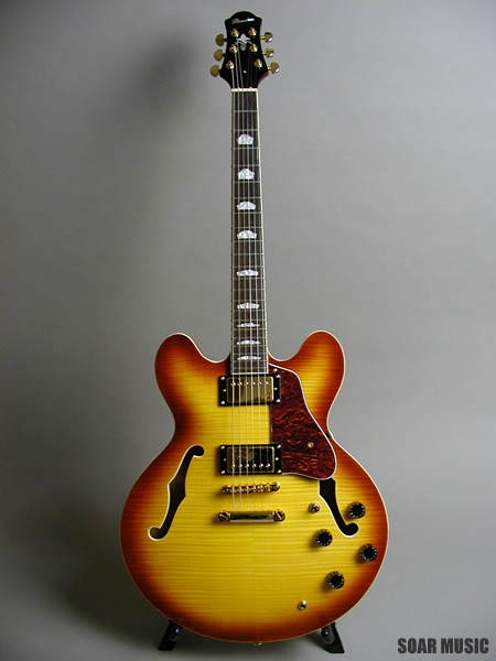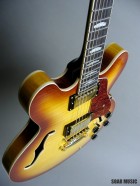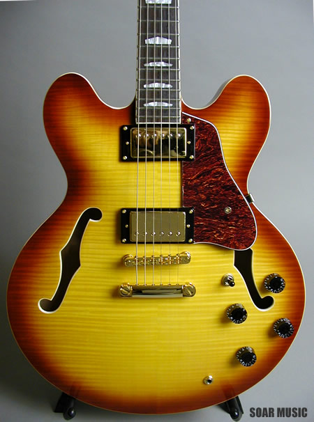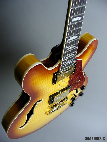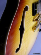 美しい外観を持つオールフレイムメイプルボディ仕様の16インチ、スタンダードセミアコースティック。センターブロックにマホガニー材を使用することで、メイプルのクリアーで切れのあるサウンドに、太くウォームな音色がプラスされています。リードプレイ、コードカッティングを問わず、使いやすい鳴りに仕上げられ、様々なジャンルにおいてセミアコの魅力を十分に発揮してくれます。