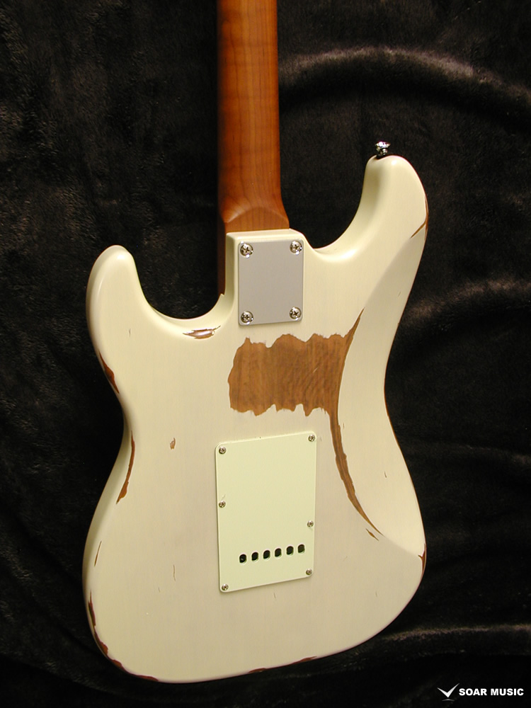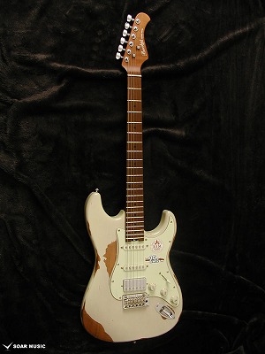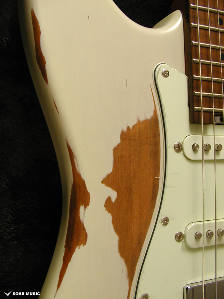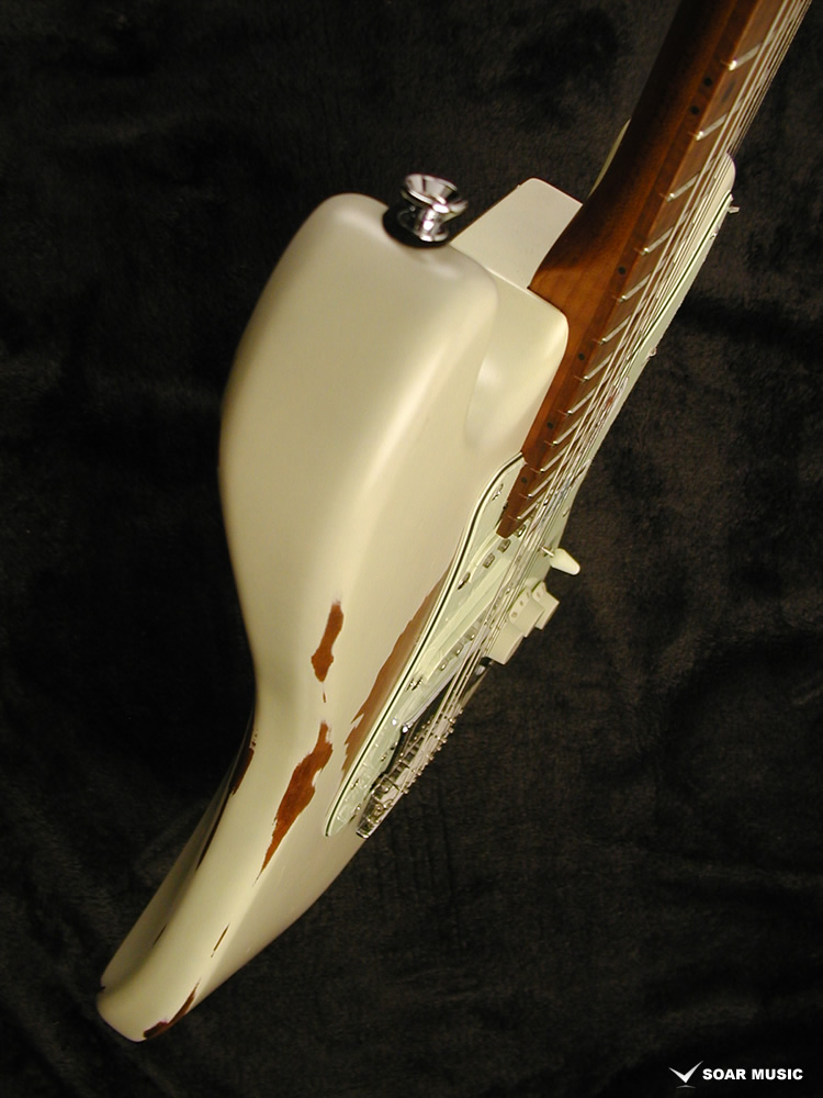 一本一本手作業で行われるボディのエイジド加工により、自然な経年変化を再現しています。一般的なグロスフィニッシュに代わりマットな風合いに仕上げることで、長年引き込んだような風格をその手に感じさせます。