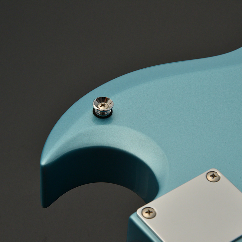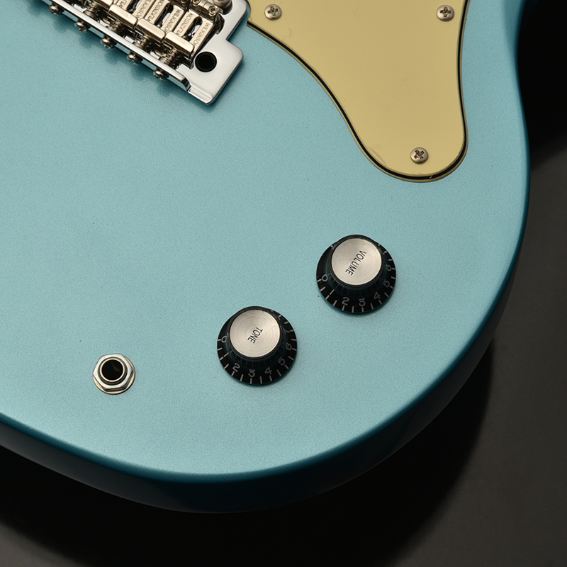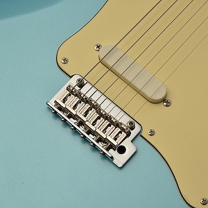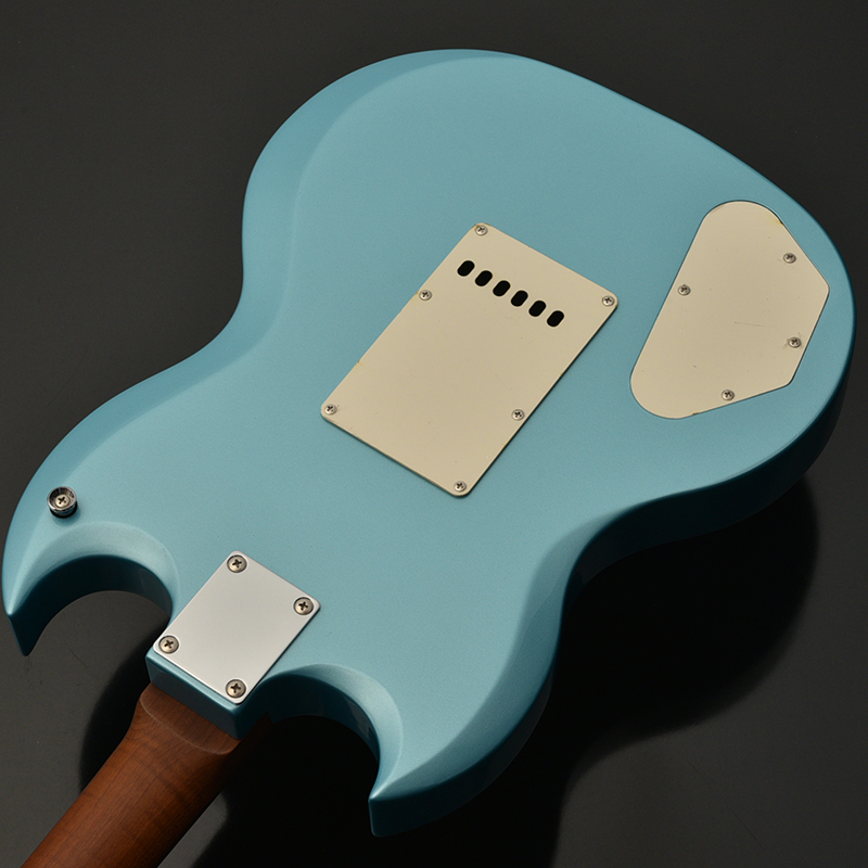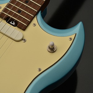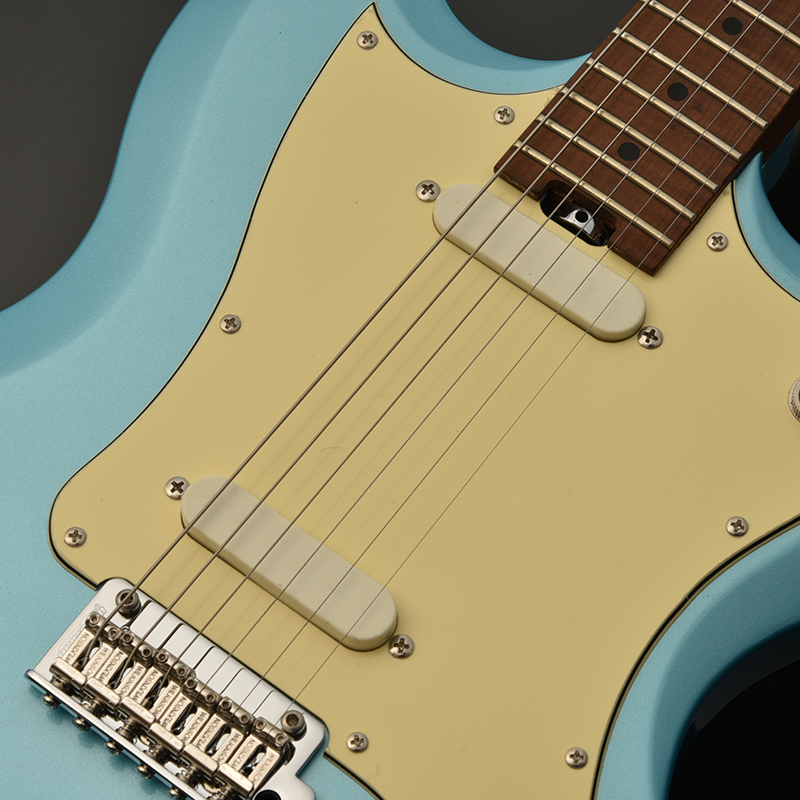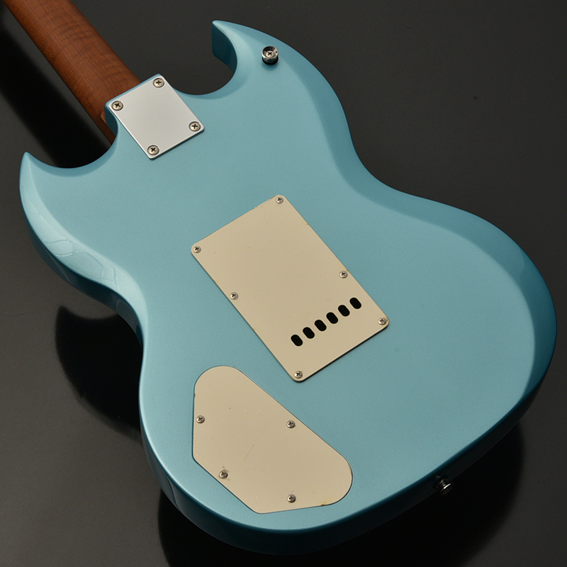 本機には、このルックスには珍しいシングルコイルピックアップを搭載しております。 フロントポジションでは、メロウなサウンド、リアポジションでは、歯切れが良くキレのあるサウンドが特徴的です。また、歪ませることでやや暴れるようなサウンドを出力いたします。 見た目以上に汎用性の高い仕上がりとなっております。