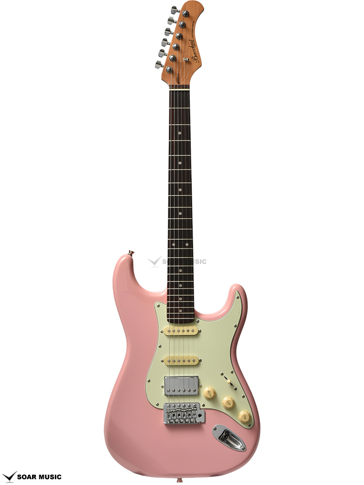 ネックにローステッドメイプルを使用したSSHレイアウトのモデル。 ピックガードやノブにミントカラーのパーツを採用し、オールドギターの風格を漂わせるルックスに仕上げました。 SSHピックアップレイアウトで粒立ちの整ったクリーントーンから、パワーあるオーバードライブサウンドまでジャンルを問わず幅広く音作りをすることができます。更にコイルタップスイッチを搭載し、リアハムはシングルピックアップの様なきらびやかなサウンドを出力します。