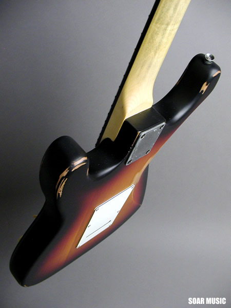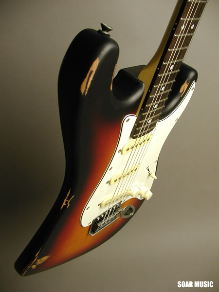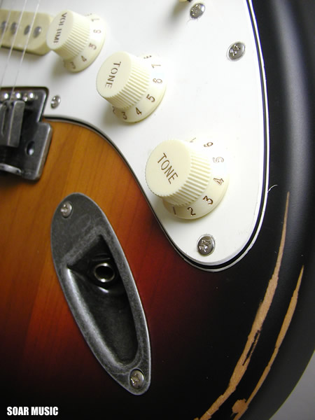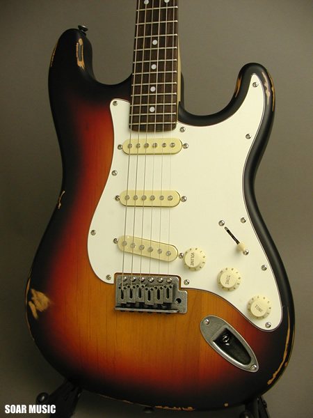 伝統的なストラトシェイプの新品ギターにレリック加工を施し、金属パーツや塗装剥げなど、