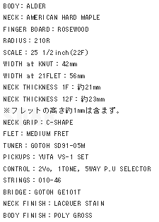 良質な素材と、優れた加工技術はもちろんの事、使用する各部のパーツに至るまで最上位機種と同等の仕様を採用。内部電装パーツもCTSポット、 Switch Craftジャック等、一切の妥協を廃しトータルクオリティーを追求しています。ピックアップも上位機種に採用されているアルニコマグネットのYUTAシリーズを搭載しています。