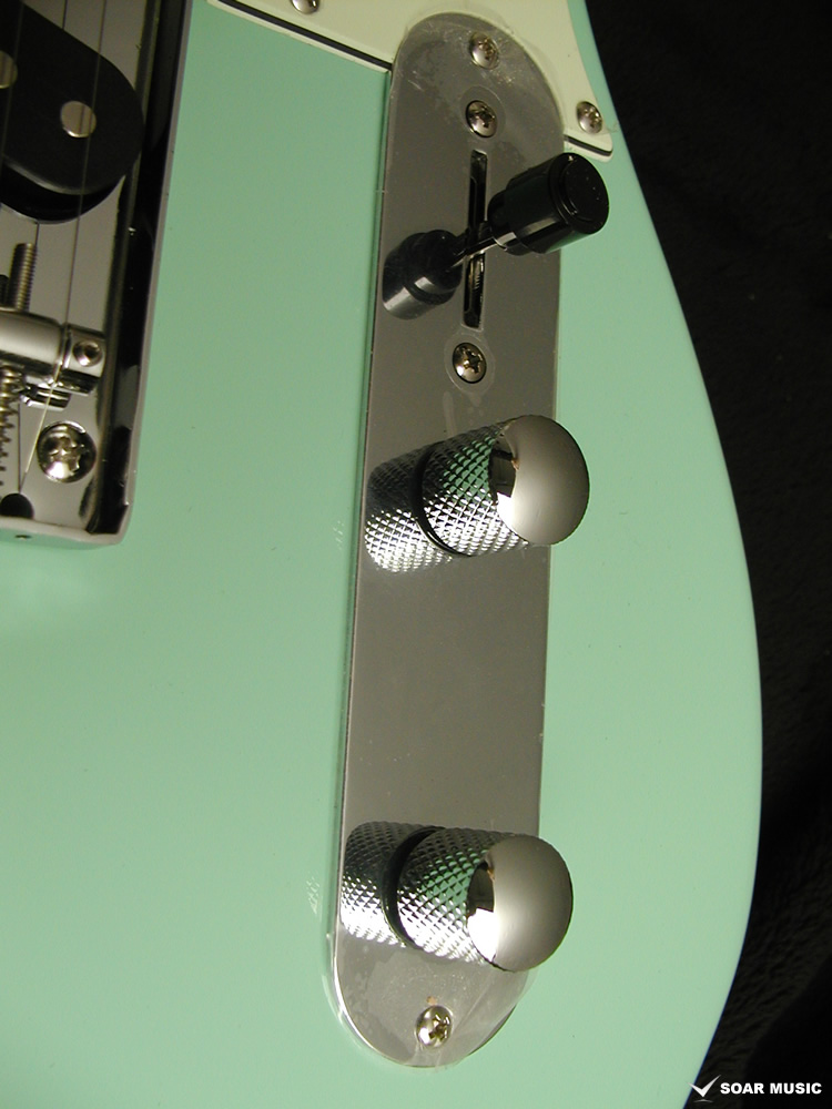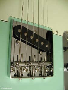 テレキャスターの特徴でもあるリアピック部分まで幅広く延長されたブリッジプレートは独特のサウンドにも大きな影響を与えています。