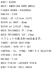 良質な素材と、優れた加工技術はもちろんの事、使用する各部のパーツに至るまで最上位機種と同等の仕様を採用。内部電装パーツもCTSポット、 Switch Craftジャック等、一切の妥協を廃しトータルクオリティーを追求しています。ピックアップも上位機種に採用されているアルニコマグネットのYUTA VJ-1を搭載しています。