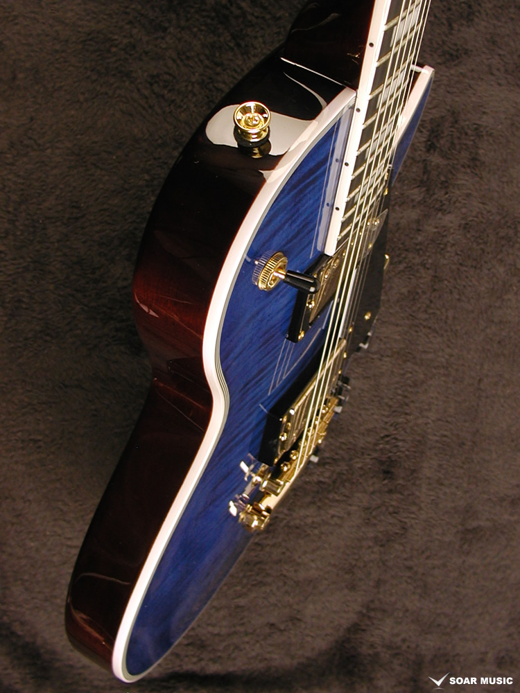 本モデルは個体毎に表情の異なるフレイムメイプルをボディトップに採用。Bacchus Handmade Series DUKEモデルのアーチ形状を踏襲したボディは、ポリッシュ塗装の反射が美しい引き締まったルックスとなりました。