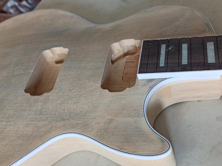 ボディとネックの接着面積が広く、振動が効率的に伝達されるディープジョイント方式を採用。接地幅が広いため、仕込み角や木工の精度が出しやすいというメリットもあります。