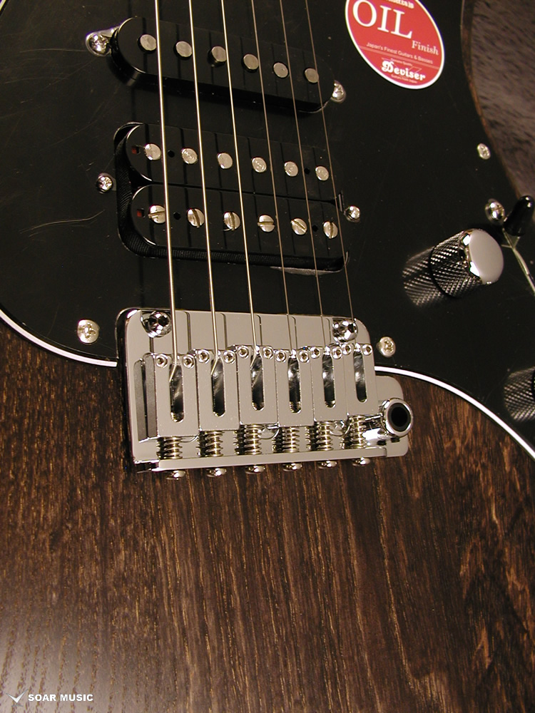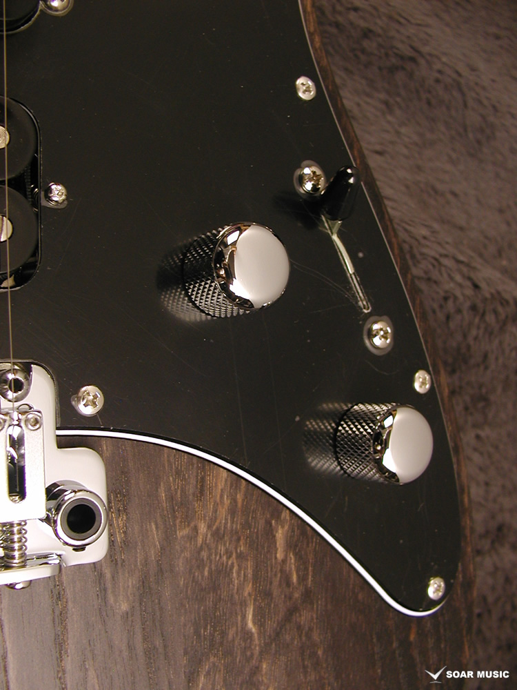 24フレットまで弾きやすいボディシェイプというモダンな仕様に合わせて、ピックアップにはMojotoneのHot Rod StratR×2とClassic HumbuckerをSSHレイアウトで採用しています。