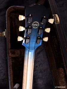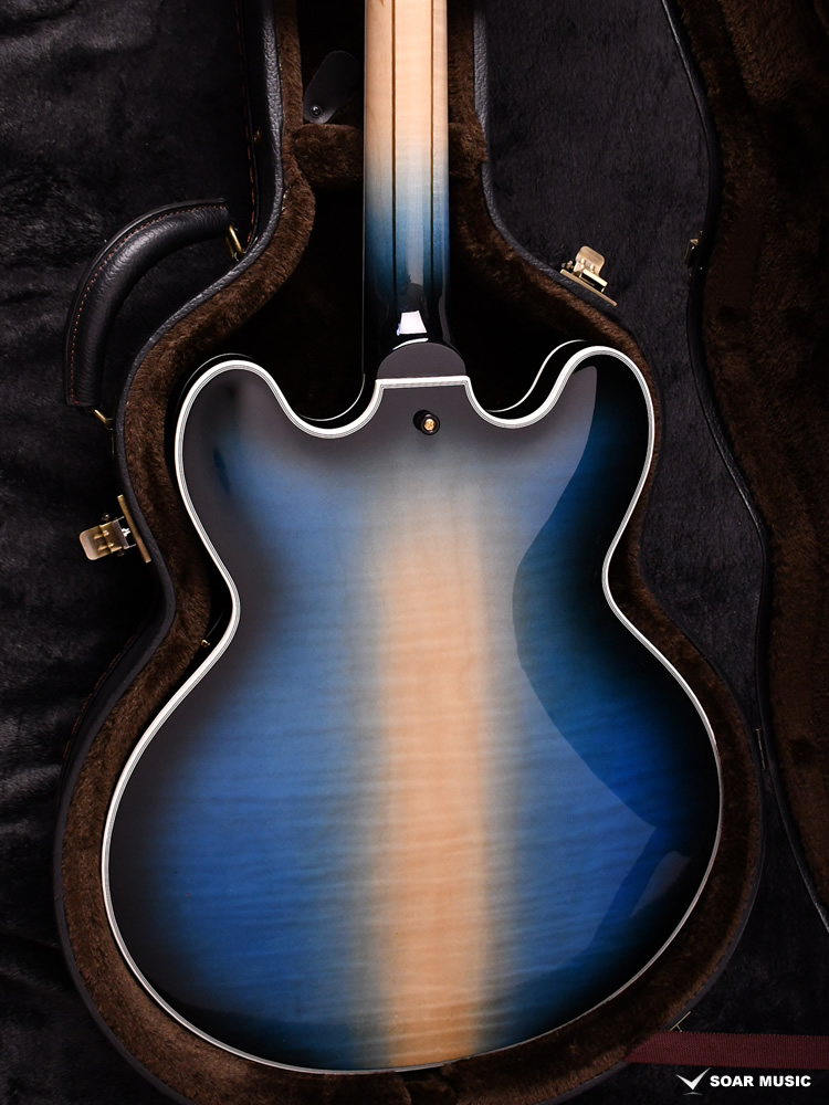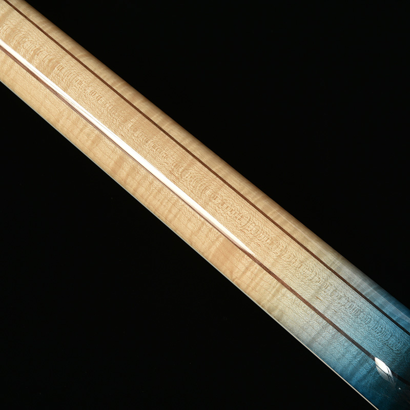 縦方向に広がる青のグラデーションにブラックのバーストカラーを掛け合わせた、塗装職人の繊細な技術が光る一本です。ボディ中央部をあえて着色せずメイプル本来の色味を残すことで、美しい色の対比が生み出されています。