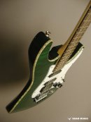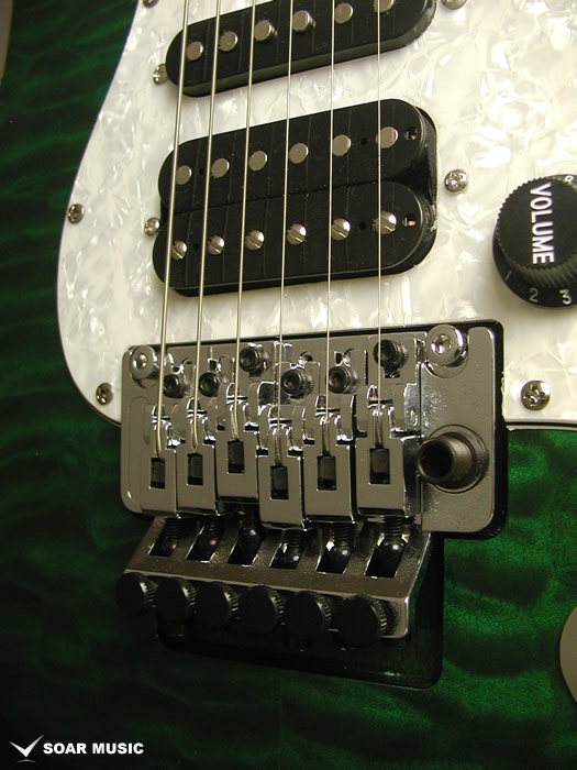 ブリッジにはロック式のトレモロブリッジが搭載されており、接点の少ない2点支持によるフローティングの状態とナット部分でしっかりと弦をロックする事でアーミングによるチューニングのずれを最小限に抑える他、より激しく深いトリッキーなアーム奏法が可能です。また、各弦で独立したサドルを設けることで、より細かなピッチ調整も可能にしています。ブリッジをはじめ、ペグやポットなどのパーツ類も限られた製作コスト内で精度と安定性を追求し、現地工房の日本人スタッフにより厳選されたパーツを採用しています。 |
