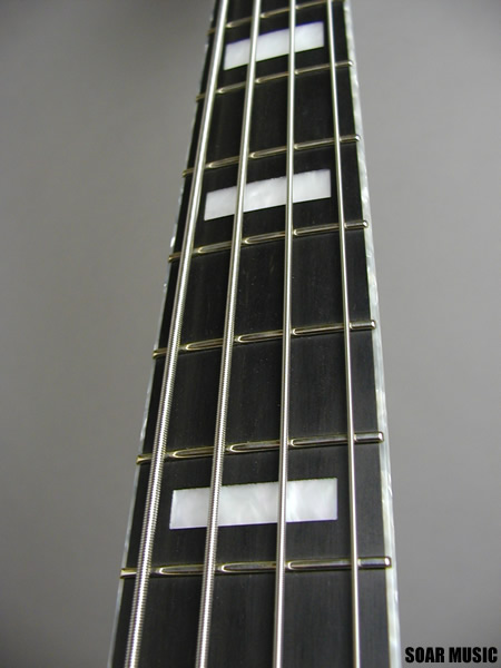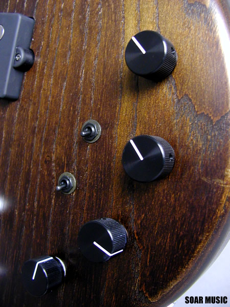 コントロール部は(ネック側から)VOLUME・TONE・TREBLE・BASSをノブに、プリアンプON/OFFとピックアップのシリーズ/パラレル切り替えをミニスイッチで搭載。 まずはVolとToneをフル、プリアンプON、パラレル、EQをフラットで試してみてください。シングルコイルにはない温かみのある独特のアタック感とサスティンを感じていただけるものと思います。 その後で、シリーズにしてEQをお好みでブーストしながらハイパワーなサウンドをお試しすることをオススメします!