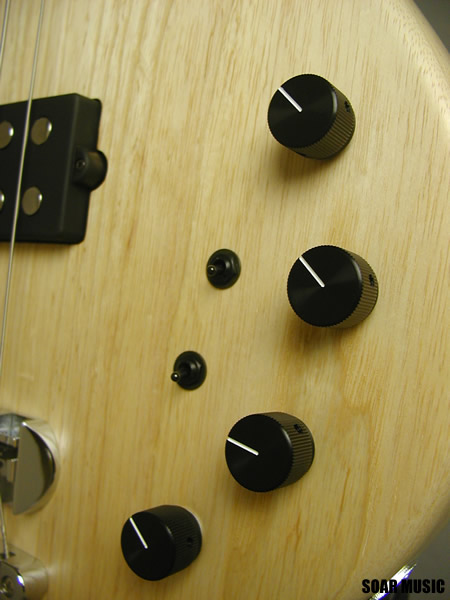 コントロール部は(ネック側から)VOLUME・TONE・TREBLE・BASSをノブに、プリアンプON/OFFとピックアップのシリーズ/パラレル切り替えをミニスイッチで搭載。 まずはVolとToneをフル、プリアンプON、パラレル、EQをフラットで試してみてください。シングルコイルにはない温かみのある独特のアタック感とサスティンを感じていただけるものと思います。 その後で、シリーズにしてEQをお好みでブーストしながらハイパワーなサウンドをお試しすることをオススメします!