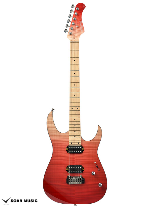 ボディトップには「フレイムメイプル」採用しており、バック材にはマホガニーを使用しました。ハムバッカーピックアップの太く分厚いサウンドが特徴です。また、24フレット仕様でウィルキンソンブリッジを採用しています。