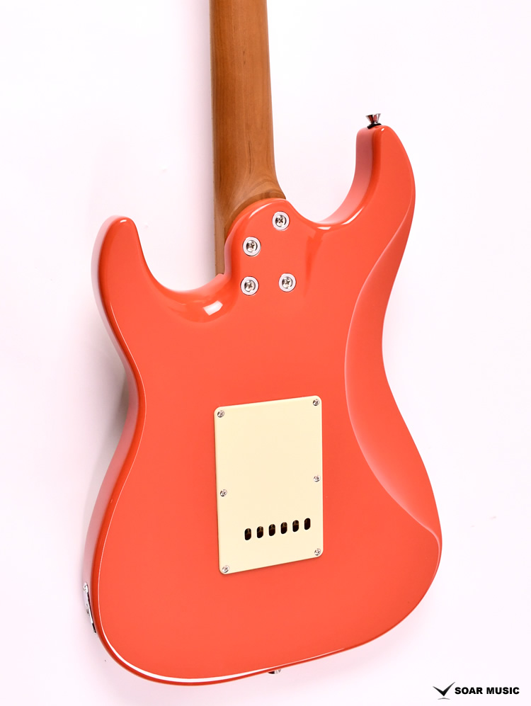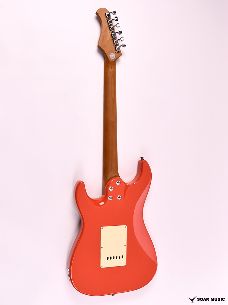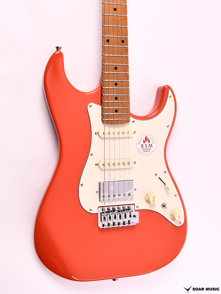ローステッドメイプルとはメイプルを高温で加熱処理して材の中の水分や油分を揮発させることにより木材を経年変化した状態に人工的に近づけた材のことです。経年変化が進んだ材は歪みやねじれが生じにくくなります。ネックに使用されるとその効果は安定性だけでなくサウンドにも及び、豊かな生鳴りと経年変化したビンテージのようなこなれたトーンを生み出します。一般的に高級機種などで用いられる材ですが、手に取りやすい価格帯に落とし込むことに成功しました。