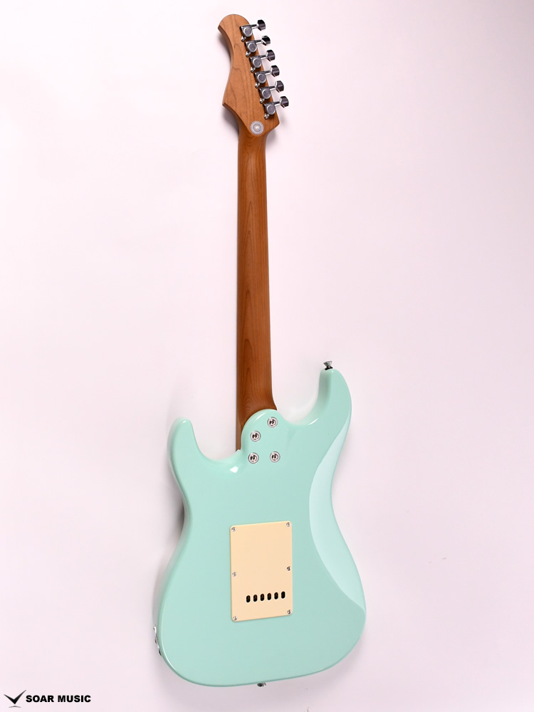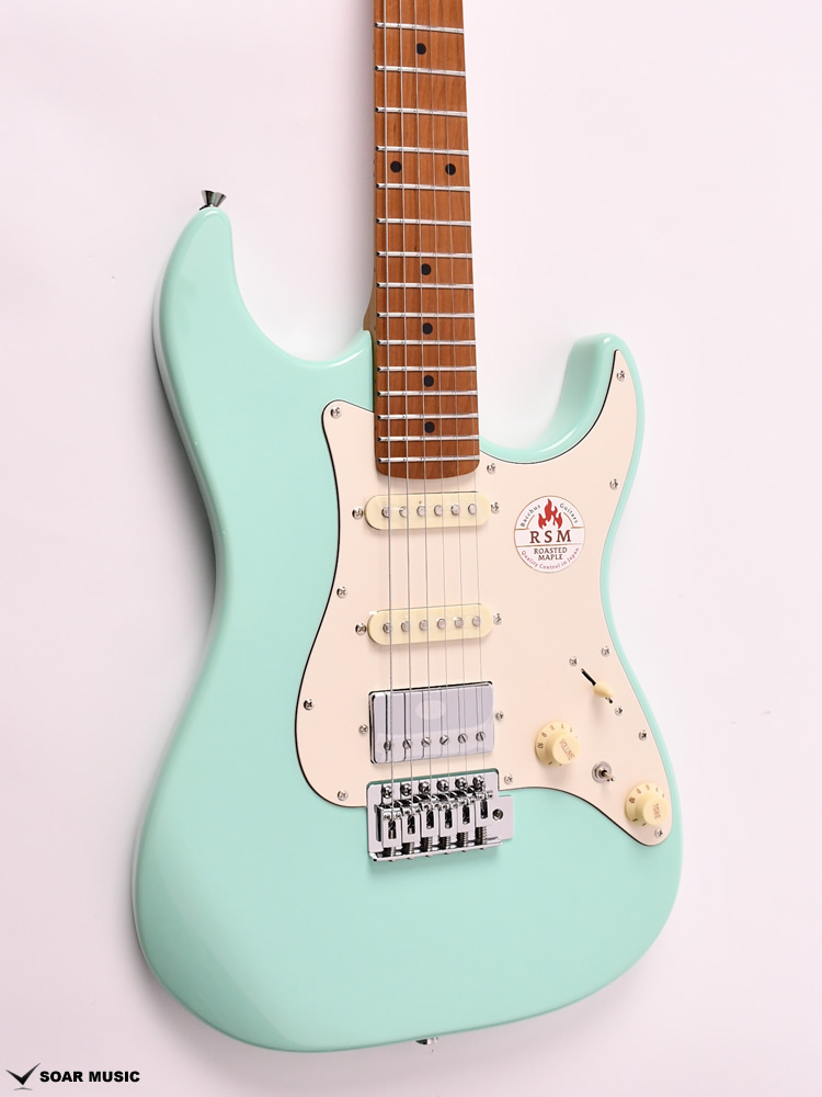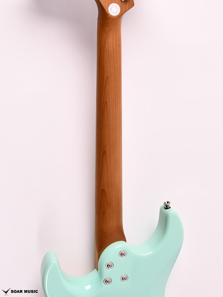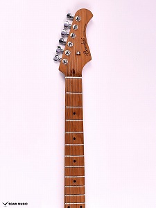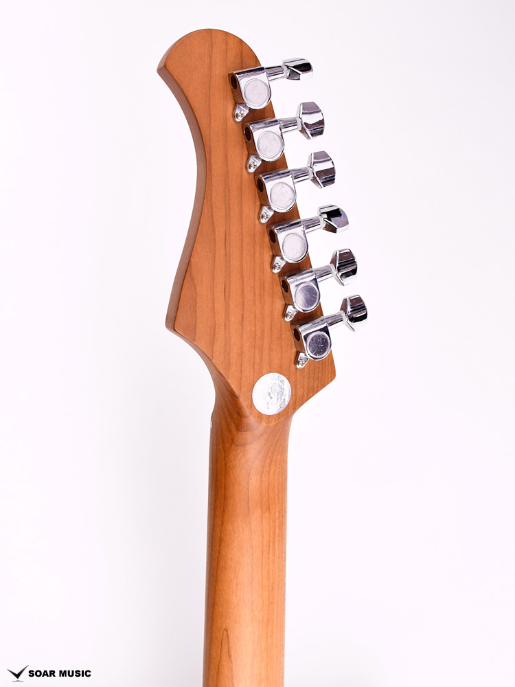 ローステッドメイプルとはメイプルを高温で加熱処理して材の中の水分や油分を揮発させることにより木材を経年変化した状態に人工的に近づけた材のことです。経年変化が進んだ材は歪みやねじれが生じにくくなります。ネックに使用されるとその効果は安定性だけでなくサウンドにも及び、豊かな生鳴りと経年変化したビンテージのようなこなれたトーンを生み出します。一般的に高級機種などで用いられる材ですが、手に取りやすい価格帯に落とし込むことに成功しました。