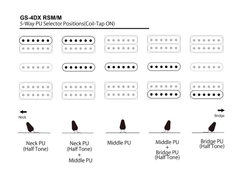 コイルタップ時には、フロント・リアそれぞれのハムバッカーがタップされ、ポジションごとに4種類の異なるトーンを出力します。