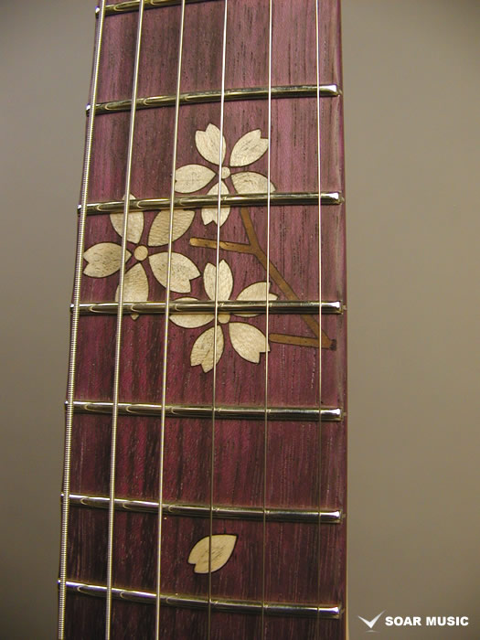 指板には桜の花びらと花(12フレット部分)のインレイが施されており、和のテイスト溢れる上品な仕上がりです。