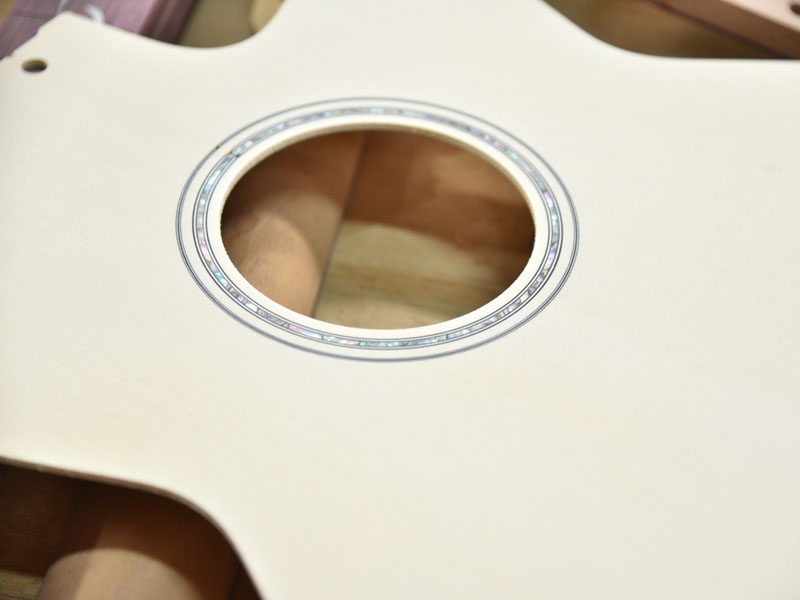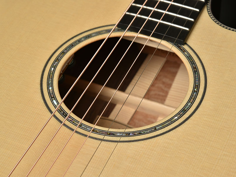 ボディの装飾である、サウンドホール周りのロゼッタにはアバロンを施しております。 ボディの鳴りを最大限生かす為、ノンピックガード仕様となっているため、ホワイトスプルースの白い木地の色味にアバロンのロゼッタがシンプルながら高級感を出す安井らしさを感じられる装飾に仕上げております。