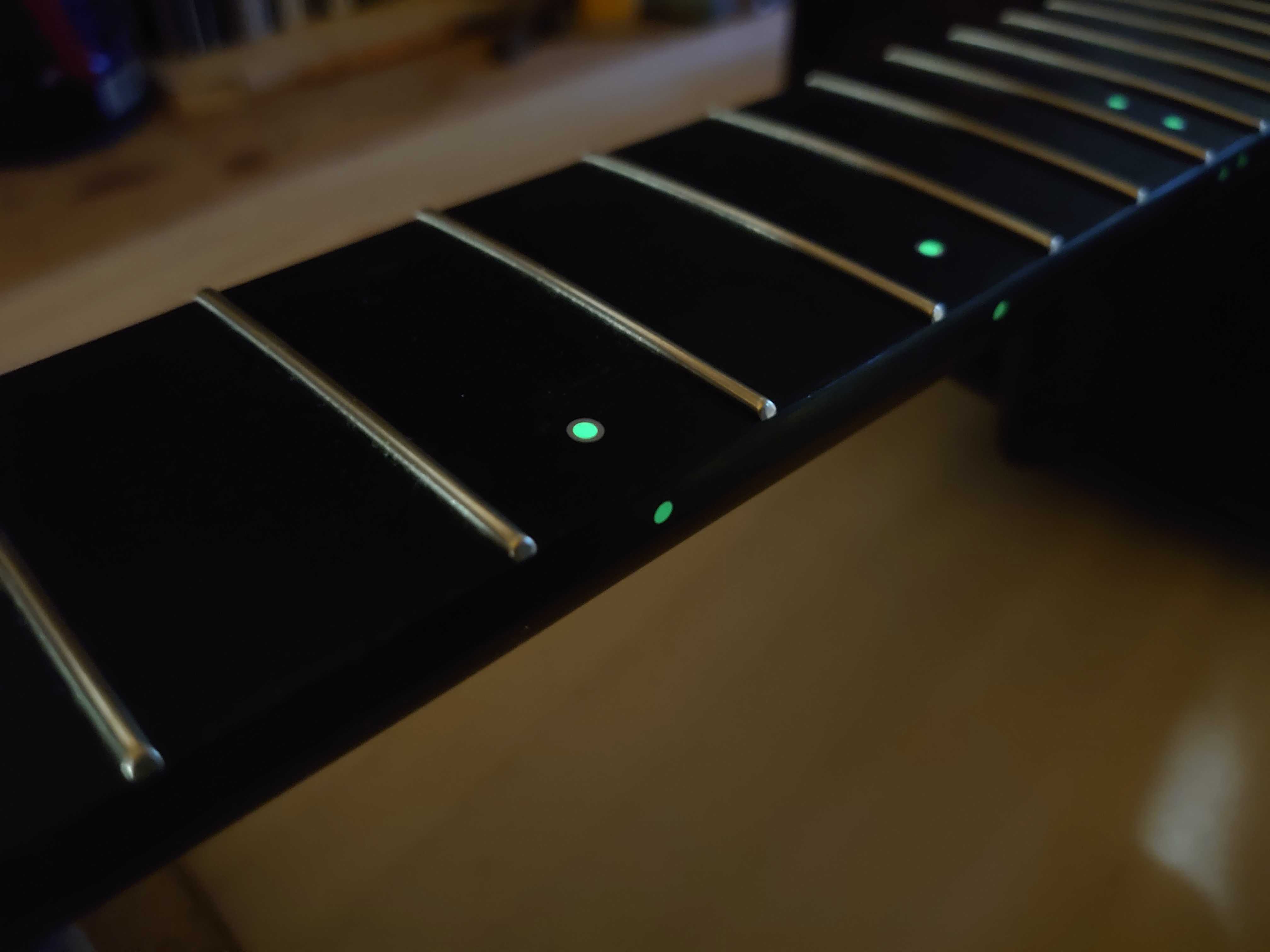 ポジションマークには指板上・サイド共にルミンレイを採用しております。 ルミンレイは蓄光素材の為、薄暗いステージなどでも視認性が良く実用性を高めております。