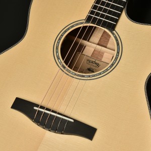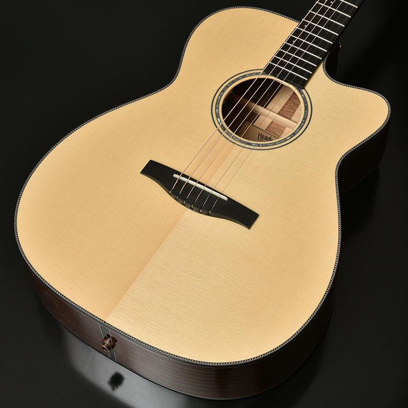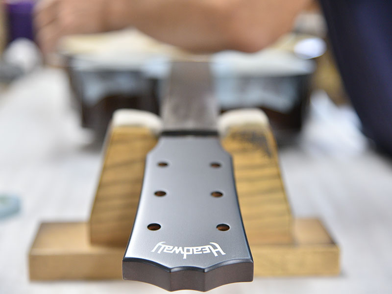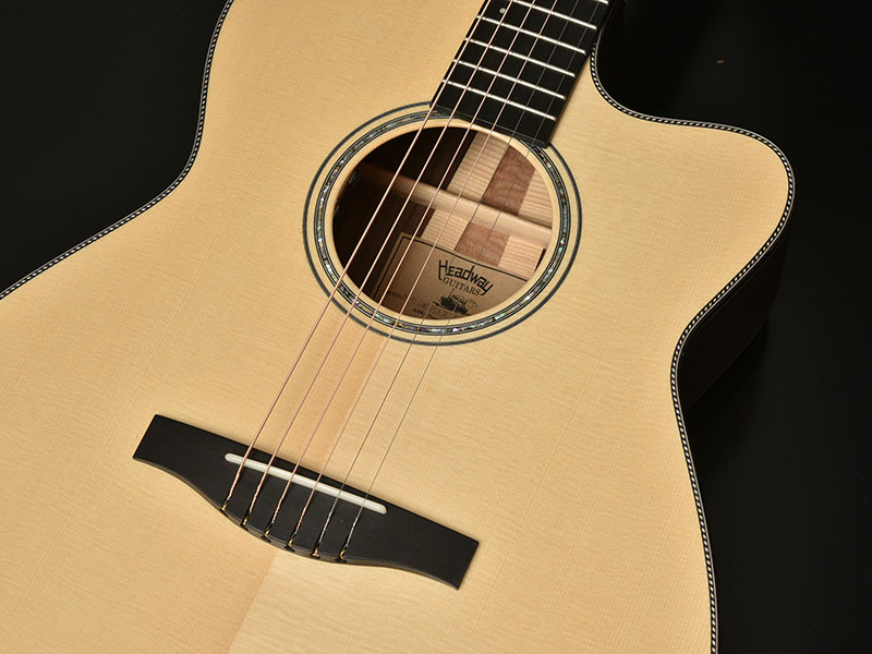 また、ボディはHeadwayのカッタウェイボディ「HC」ボディですが、ボディの厚みを通常のモデルより3o薄く仕上げております。 これは抱えやすさを重視しながらも、Headwayのこだわりである生音もしっかり鳴るギリギリのボディ厚に仕上げております。 ボディ厚が薄くなったことにより、レスポンスの良さと煌びやかな高音域もこのギターは手に入れています。