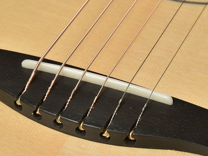 ブリッジにはピンレスブリッジを採用しております。 ピンレスブリッジはサドル上での弦の角度が浅くなることでテンション感が柔らかくなるメリットがあります。