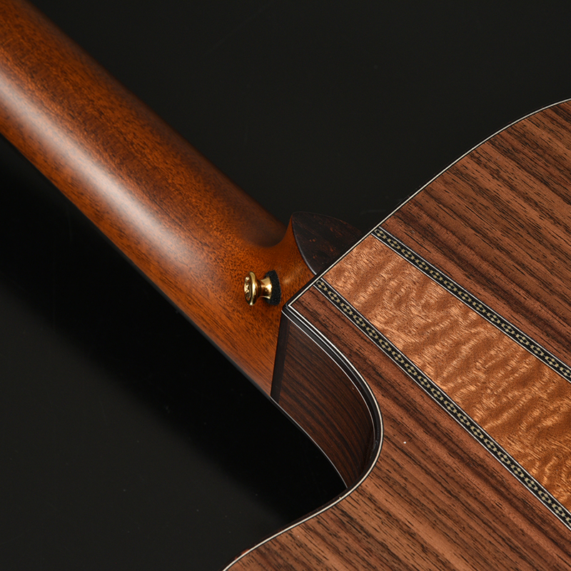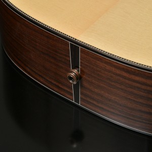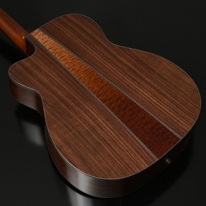 ホワイトスプルースは硬質でパリッとしたサウンドが持ち味で、安井が狙うサウンドの基礎となります。サイド・バック材にはこちらもセレクトしたインドローズを使用しながら、バックのセンターに最高級キルトマホガニーを挟み込む3ピースバック構造になっております。 ローズウッドのアタック感とブライトなサウンドに加え、キルトマホガニーの中低音・柔らかさをエッセンスとして組み込んでおります。