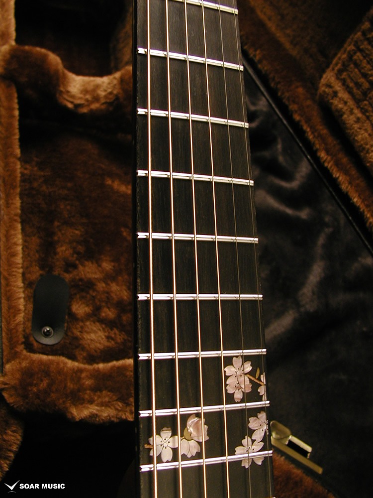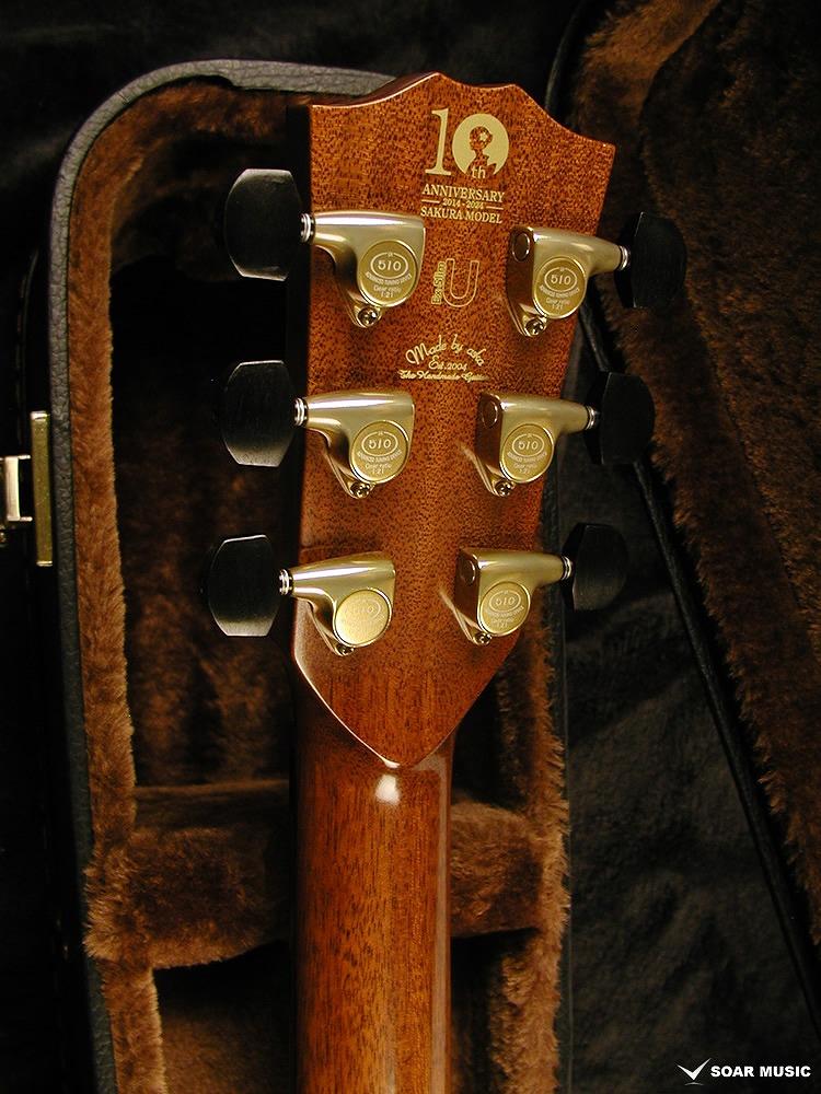 桜ギターの製作から10周年ということもあり、桜の要素を取り込みながらもフィンガーピッキング向けの仕様を追求した設計にしました。これまでのモデルにも採用しているテーパードフィンガーボードやピンレスブリッジ、ツイストレスなどの仕様を盛り込みながら、今回は着色にこだわって仕上げました。特にボディサイド&バックのカラーリングは下地となる桜材の色を生かせるように薄い白の塗装で施すことで、実物のソメイヨシノの花びらに寄せた色味にしました。